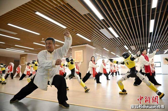 2月13日,太极爱好者和机器人在邯郸太极文化交流中心表演太极拳。 周绍宗 摄