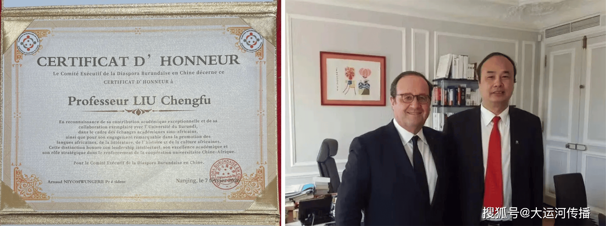 2月7日,在金陵佳盛精品酒店举办的2026布隆迪侨民论坛上,浙江越秀外国语学院非洲大湖区研究中心执行主任刘成富教授荣获布隆迪侨民协会(中国)颁发的中非人文交流贡献荣誉奖。颁奖词如下:“感谢您在中非学术交流框架内与布隆迪大学典范性合作与卓越贡献,在推广非洲语言、文学、历史与文化中所取得的杰出成就,在加强中非大学合作中的智力引领、卓越的学术研究以及颇具战略指导的作用,特发此奖”。