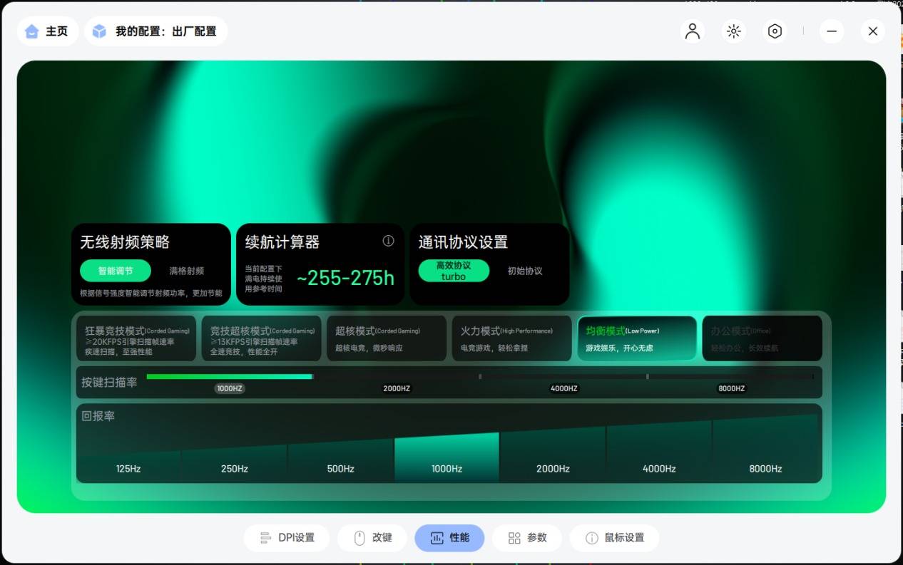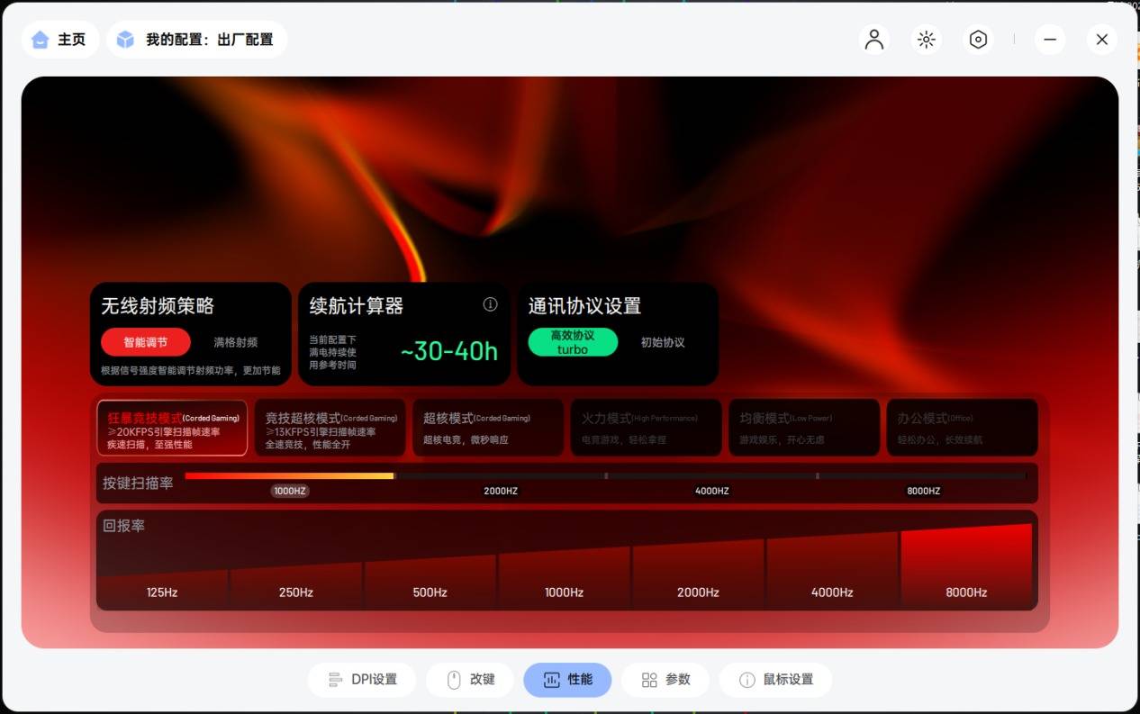 ●性能模式深度控制:A HUB 允许用户在不同回报率下选择不同的性能模式,例如在8K回报率下,用户可以根据需求选择更激进的性能释放,或者在保证高回报率的同时,对功耗进行更精细的控制,这体现了驱动对鼠标核心算力的统筹能力