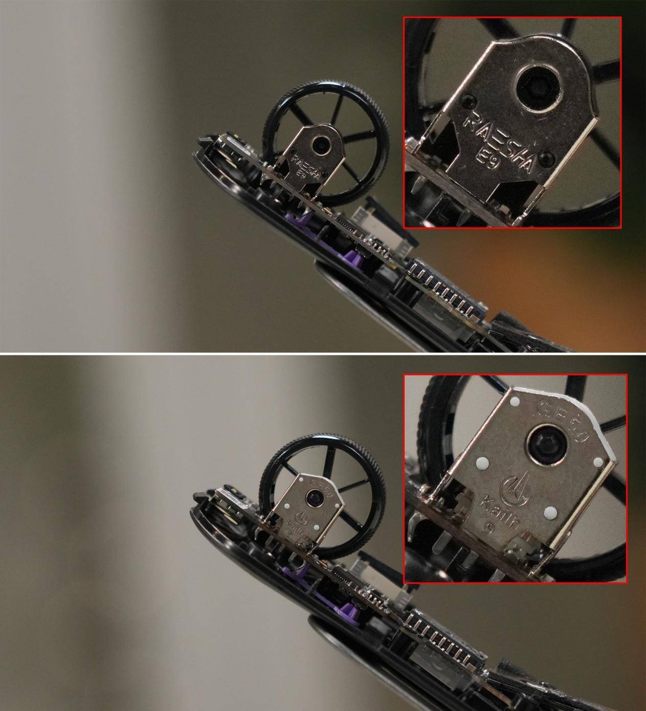 编码器方面,前两者采用的是200万次凯华定制编码器,两款Air版则是采用200万次瑞讯光学编码器。手感方面,两款Air版滚轮阻尼力度明显更轻一些,可能也是为了匹配Air的定位。