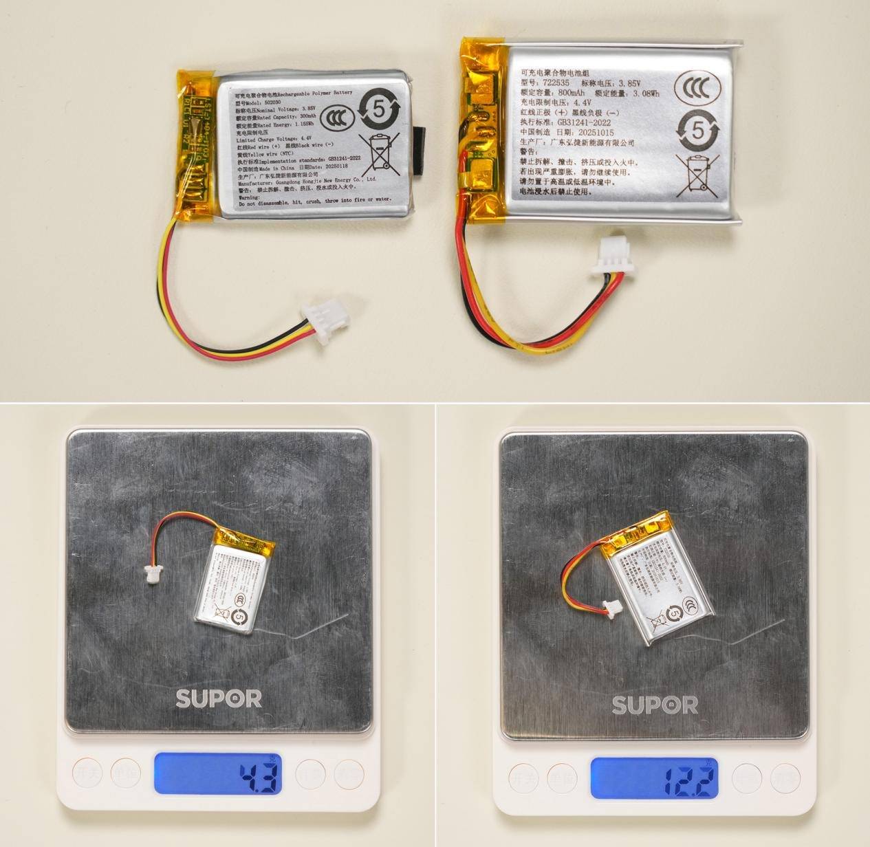 800mAh电池大约是12.2g,300mAh电池大约是4.3g,差值为7.9g。看来减少的重量,主要都出自电池的调整了。
