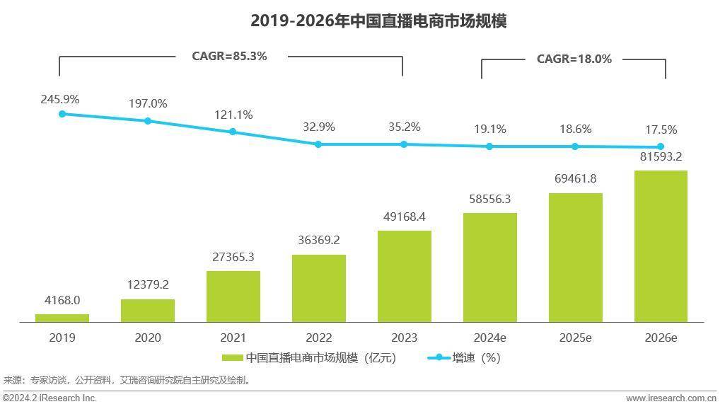 直播电商增速也从爆炸式的245.9%,逐渐下落至两位数,据艾瑞咨询预计,2024—2026年,其增速会稳定在18%左右。