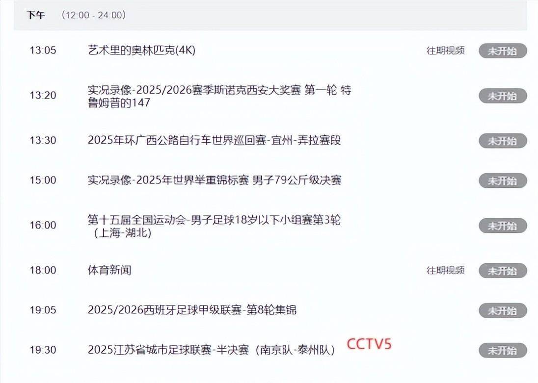 下午时段播出了全运会男子足球U18组小组赛,广东队3-2险胜上海队;晚间体育世界栏目报道了环广西自行车赛第三赛段,荷兰车手范德普尔夺得冠军。